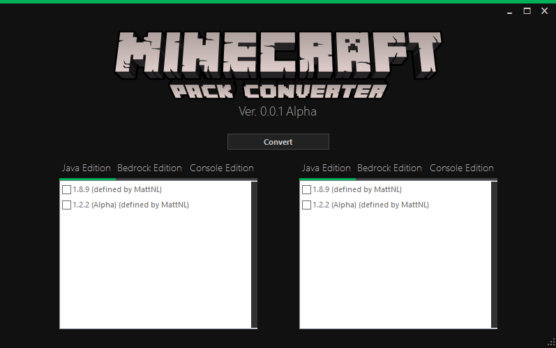 A universal Minecraft resource pack converter in development since 2018. It supports Minecraft: Java Edition, Minecraft (also known as "Bedrock"), and Minecraft: Legacy Console Edition resource, texture, and "Mash-Up" packs. It has gone under several rewrites, which is why it has yet to release, and will be open source and completely free to use. Image shown is a heavy work in progress and does not reflect the final product in any way.